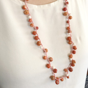 白い珊瑚とコンビネーションでピンクの糸で可愛らしく。