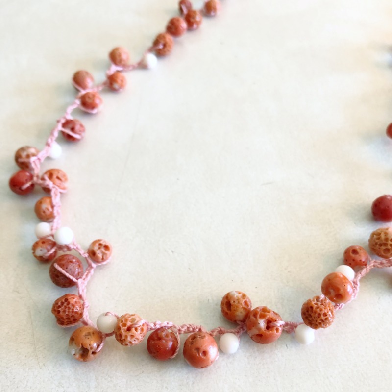 穴の空いた珊瑚と白い珊瑚をミックスしてネックレスをリメイクしたいというご依頼がありました。