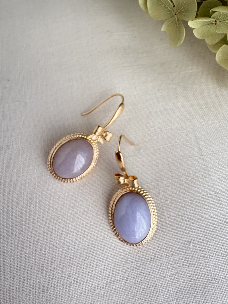 柔らかなラベンダーのカルセドニーが、リボンとフックを得て、ふわりと揺れるピアスへと生まれ変わりました。